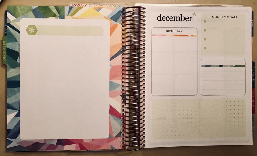 For every month you have a page with a slogan and after that you have a page where you can write birthdays, goals and other things down. Then you find a monthly overview and according to that the weekly pages follow.
