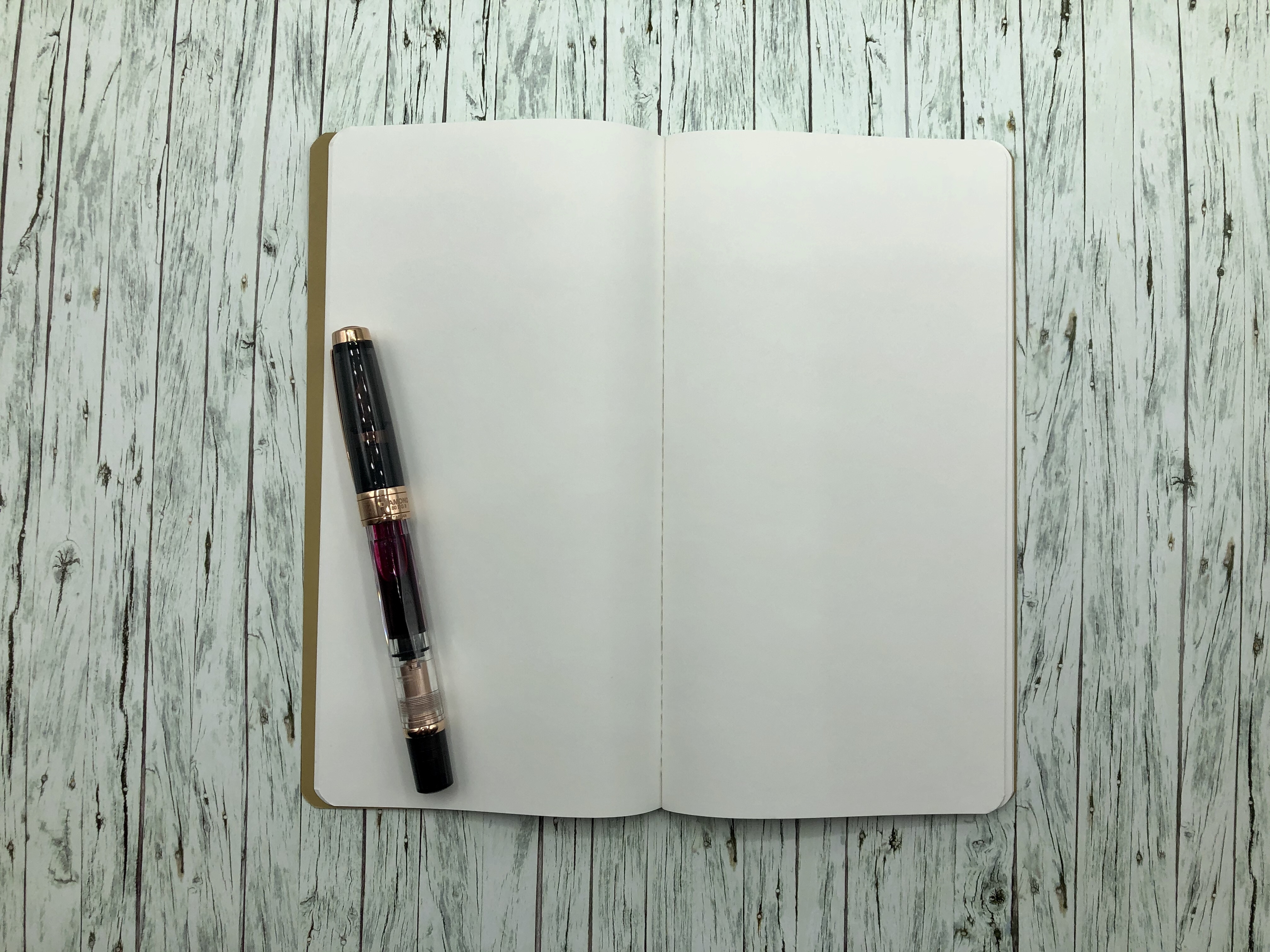 When you open the notebook you can start your journaling right away. There isn’t any index and the pages aren’t numbered. The paper is really soft and thin. I love to write with fountain pens and the pen slides over the paper so smoothly. If you like to use brush pens, stamps or alcohol based markers then you should be aware that ghosting and bleeding could happen.