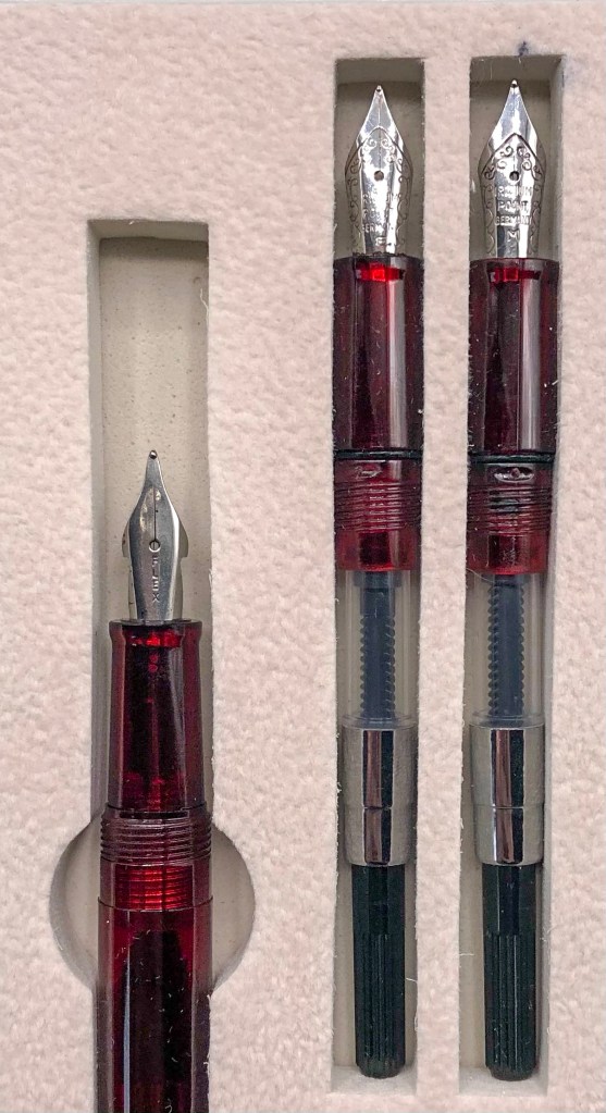When you open your box, the pen with the nibs and the converters lay on a soft beige ground. There isn’t any space that something could move. Everything is safe and secure. I even tried to shake it but nothing fell out.