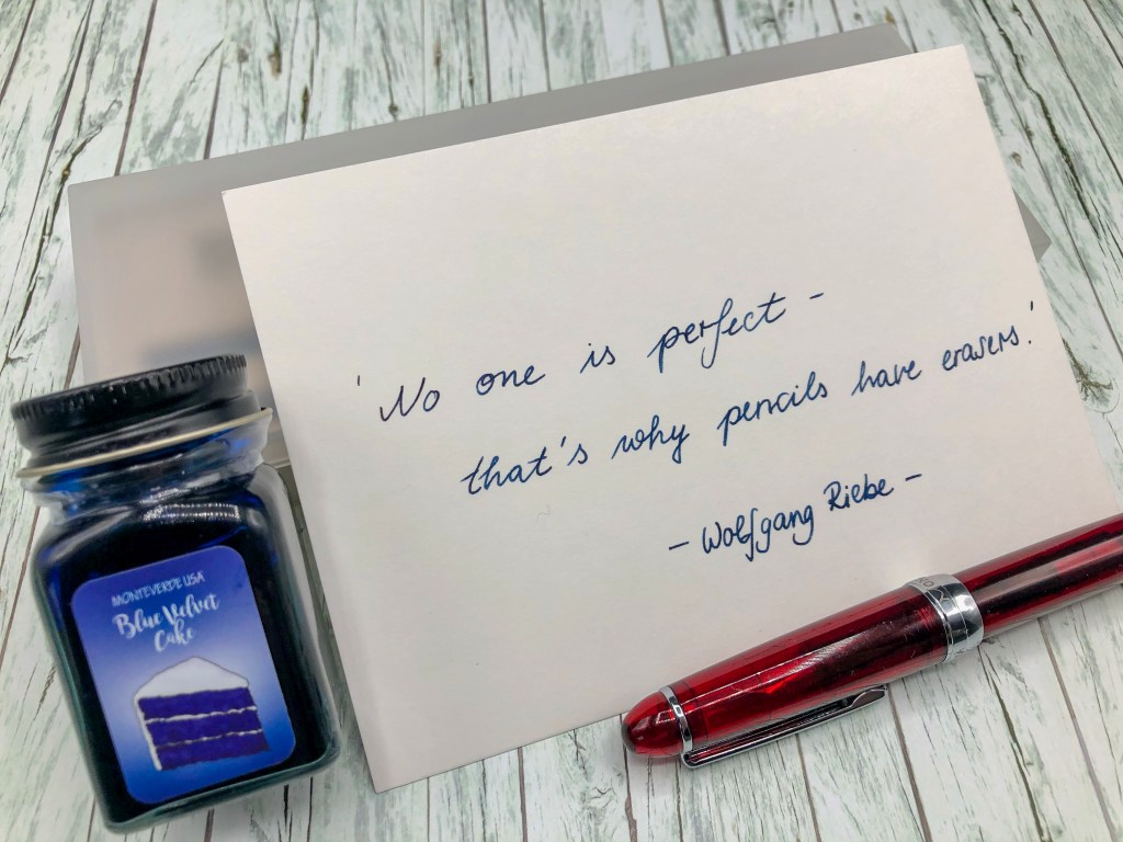 In addition to the fountain pens, my husband also ordered some ink by Monteverde for me. I got Blue Velvet Cake and Cherry Danish. I really like the idea to give the inks‘ colours names after sweets and cakes.