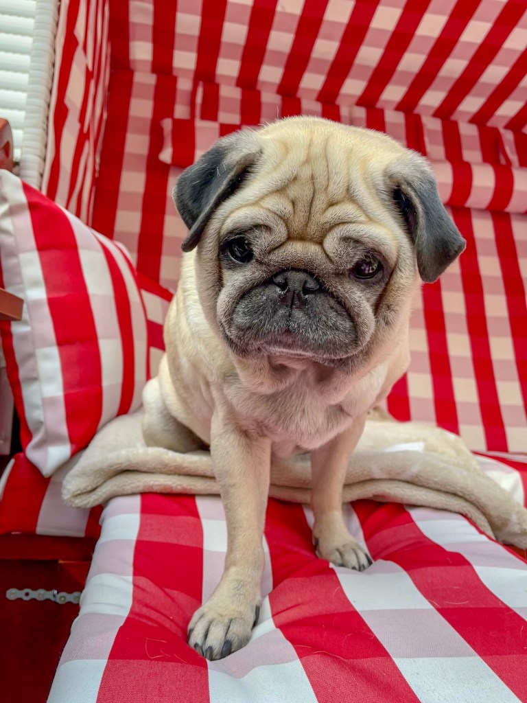 As you know, I have a little pug girl called Maya. She is going to be 10 in May of this year. She is so adorable and has a really kind and good heart. We discovered two spots on her which were black, looked like blood blisters, and they got bigger and bigger, so we decided to go to her vet. Fortunately, it’s nothing bad, so we got some medical liquid which we need to put on these spots. And indeed the spots are getting smaller. That is really good because I had a panic attack that it could be something bad.