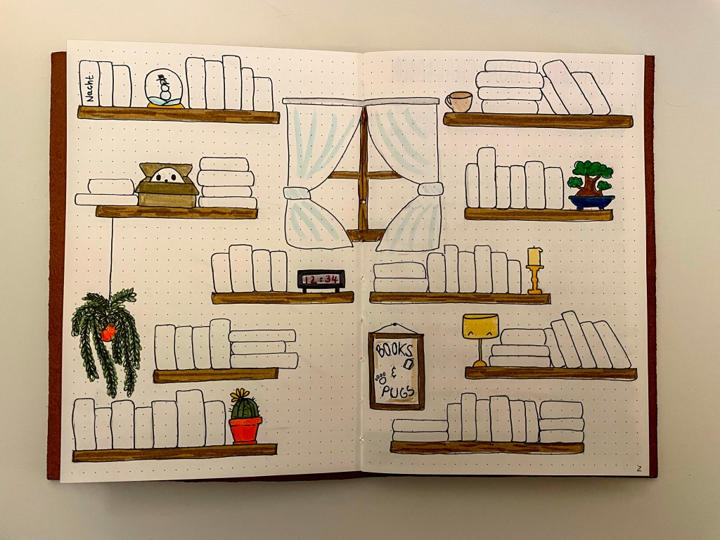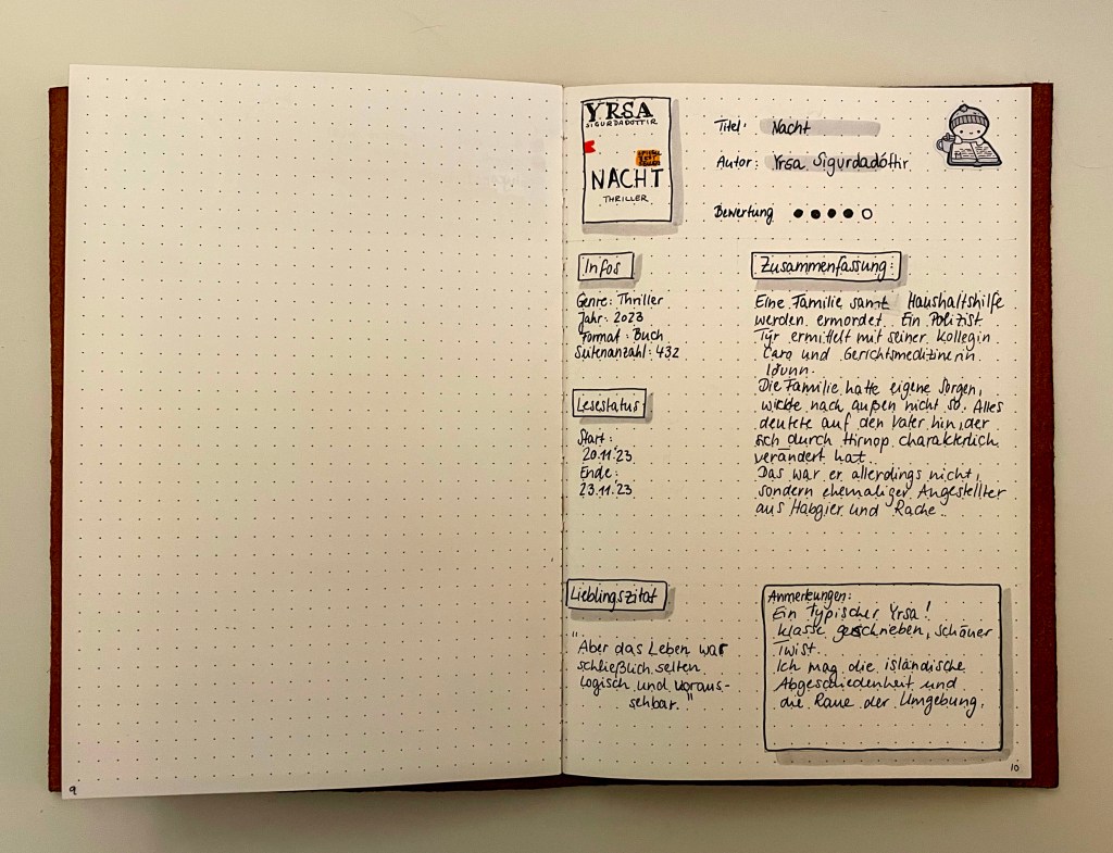 Then I have my „one book per page“ section. It is the very first time that I write journal entries in German, which is a little bit strange but also nice in some way. In these pages, I doodle the cover of the book, name the title and the author. There are also some small pieces of information like year of publication, genre, number of pages, as well as the dates of when I started and when I finished the book. I write a short summary and some personal notes. If I have a favourite quote, it will be added there as well. Finally, I rate the book from 1 to 5 (five is like perfect and one is like „not my type“).