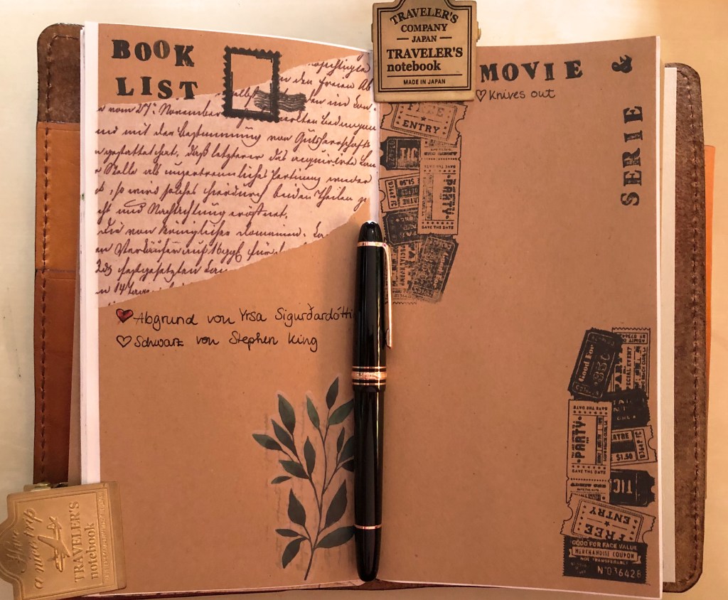 I use a Travelers notebook with three inserts. One is a Everyday Journal by GalenLeather. I love the thin paper. It is my monthly calendar. Then there is a dotted one as my weekly planner and for smaller list, trackers and doodles. The third one is my writing journal. I like to write scenes or very short stories. Normally, I had them in my bullet journal everywhere where I had a little bit of space left. 🙂 But this year I would liket to give them more space, so I can evolve them and maybe I will write my first cozy mystery. My husband would love to see it. 😀