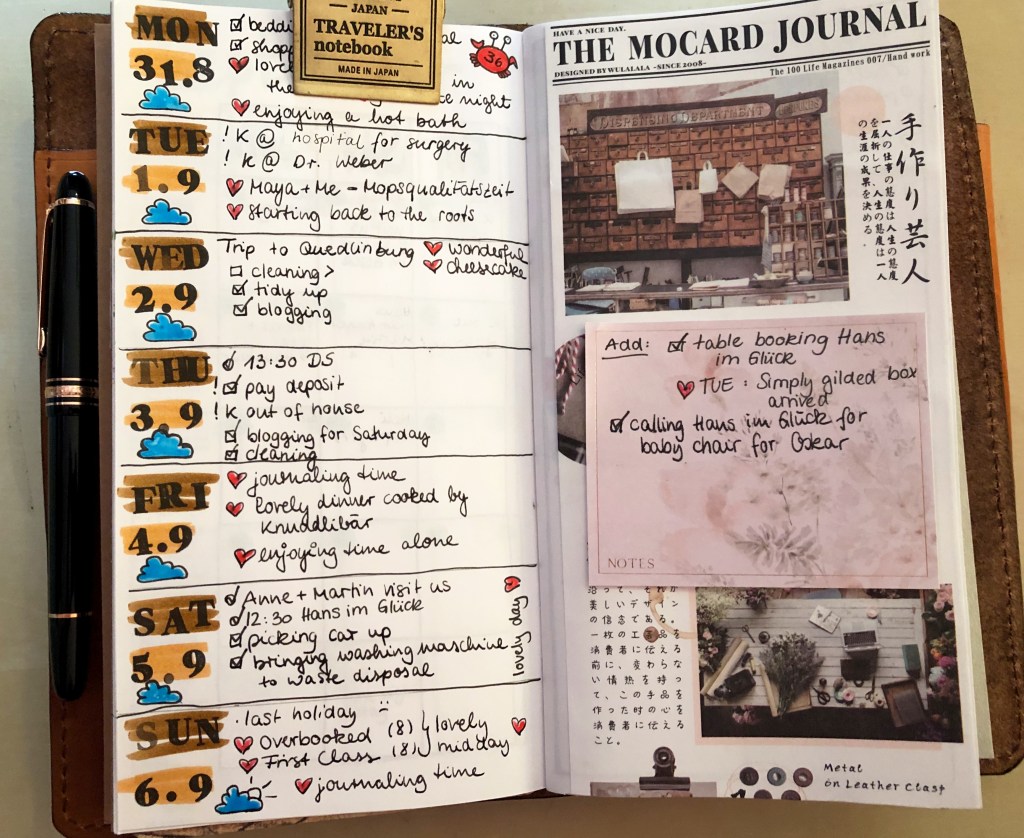 Travelers Notebook had three inserts: a blank one, the monthly and the weekly one. I liked the blank one because there was this freedom to be creative, messy and have fun with it. The monthly one had a sticker for each day which showed what I did that day. The weekly was scrapbooking. Ok, I tried to scrapbook 😀 A real scrapbook pro would say it was scrapbookish 😀 But that is totally fine for me.